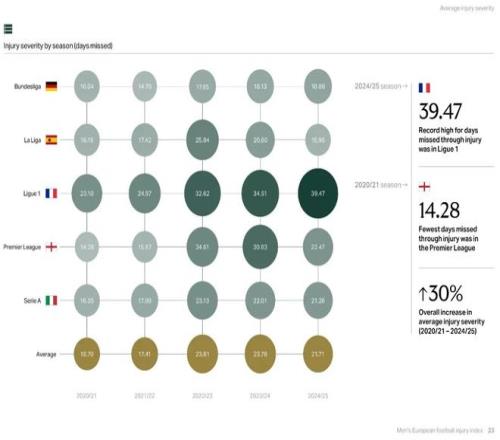 豪顿报告显示过去的5个赛季,五大联赛单赛季平均伤病时间普遍增长。法甲从23.1天飙升到39.47天,形势最严峻。英超从14.28天增至22.47天,2023/24赛季峰值也达到30.63天。究其根源,近5个赛季愈发紧密的赛程和不断增加的比赛是主因。曾与曼联和红牛集团合作过的精英运动员伤病风险专家索普表示:“大赛后的伤病激增符合逻辑,参加国际大赛的球员都是高薪精英球员,他们的伤病会造成俱乐部成绩和经济的巨大损失。”